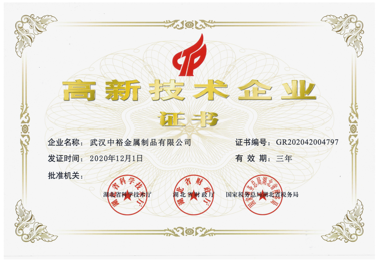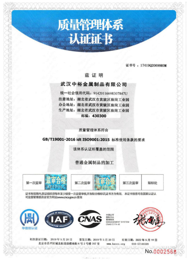 武漢中裕金屬制品有限公司(以下簡(jiǎn)稱公司)成立于1996年8月,民營(yíng)私人獨(dú)資企業(yè)。2010年8月投資1800余萬(wàn)元,在前川油崗工業(yè)園征地20畝,新建5000平方米的生產(chǎn)車(chē)間和1100平方米的辦公大樓,2011年8月全部峻工投入使用。